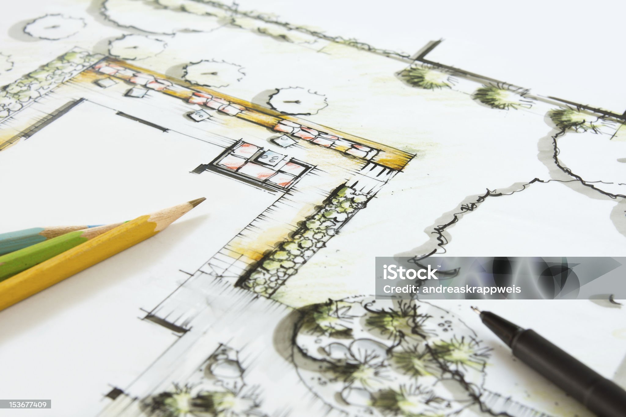 Landscape Architecture – Blueprint for a private Garten. Crayons and Pen lying on the Plan. Idea and Drawing is my own Work (Andreas Krappweis Private Gardens), Building, Ground and Garden is fictitious.